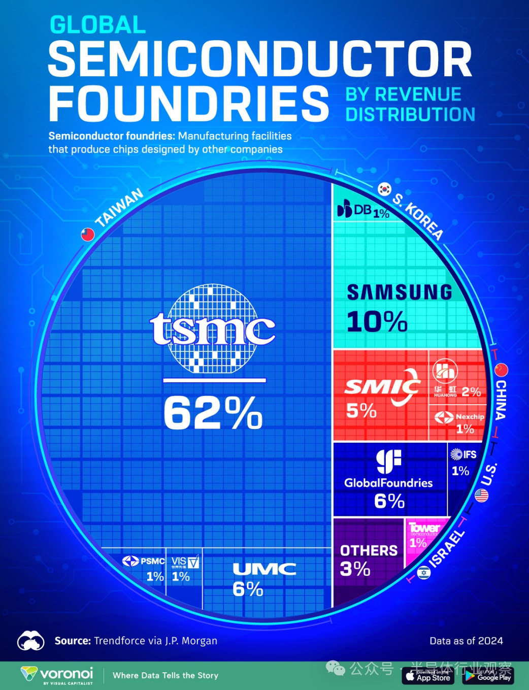 根据Visual Capitalist的统计数据,2024年全球晶圆代工行业总收入达到了1317亿美元,其中仅台积电一家便占据了62%的市场份额,加上联华电子、VIS和PSMC等其他台湾公司的贡献,台湾整体份额超过70%,继续稳居全球半导体制造的核心地位。紧随其后的是韩国,不过三星代工市场份额从2019年的16%下降到了2024年的10%,足见三星在代工领域的挑战。美国的GlobalFoundries和英特尔代工服务(IFS)合计占据6%。以色列的Tower semiconductor占1%。值得注意的是,2024年大陆晶圆厂在市场份额上持续增长,中芯国际占据了5%,华虹占据了2%,晶合集成占据了1%,合计拿下8%的市场份额,而且增长势头强劲。
