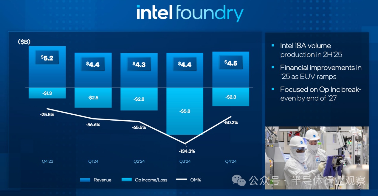 英特尔的IFS收入正在平稳增长中,2024年英特尔Foundry部门全年收入为175亿美元,同比下降7%。去年,英特尔与亚马逊签署了一份价值数十亿美元的多年期协议,为其AWS的AI数据中心代工芯片,这标志着英特尔在代工领域的重大突破。然而,英特尔的代工业务目前仍面临严峻挑战。由于英特尔近年来大举扩张产能,包括在各地兴建新厂、购置先进设备,这导致了巨额的投资和运营成本,2024年巨额亏损达134亿美元(如图所示)。