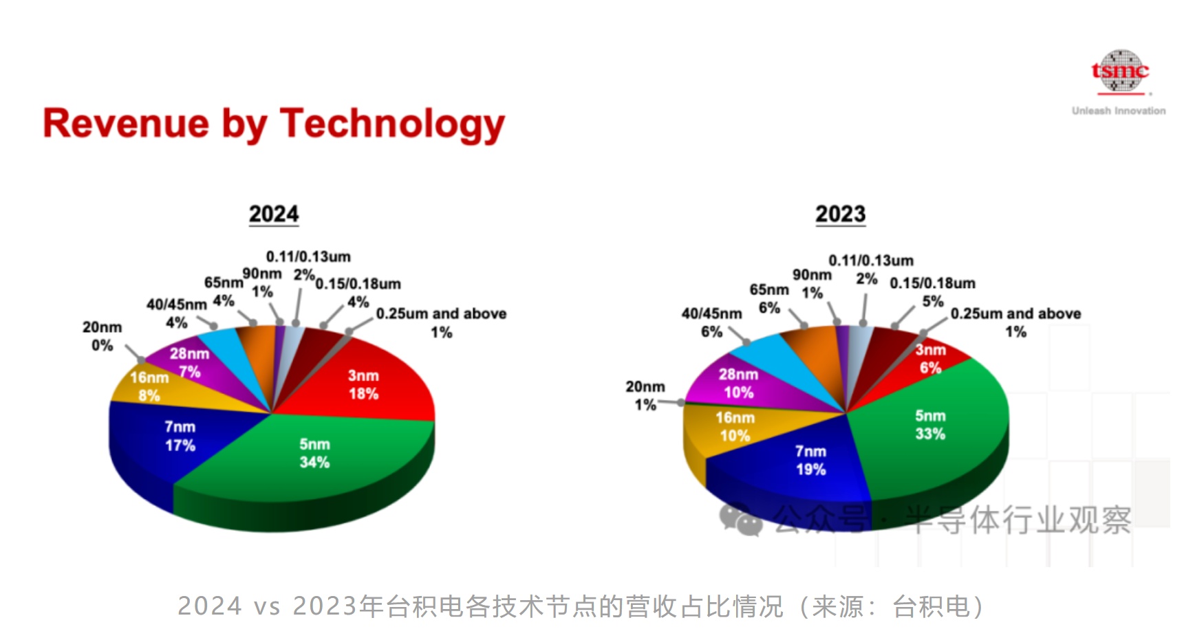 从台积电的各工艺节点的收入占比来看,才量产没几年的3纳米工艺在2024年就贡献了台积电18%的晶圆收入,5纳米占比为34%,7纳米占17%。先进技术(包括3纳米及以上工艺)占总收入的69%,较2023年58%的占比有所提升。