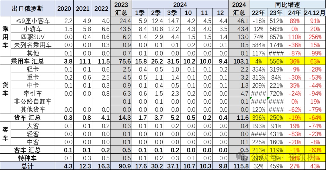2024年中国对俄罗斯的新能源车的出口剧烈波动,俄罗斯的进口规则根据供需不断调整。2024年牵引车、重卡等产品的中国出口暴增后回落,陕汽和中国重汽的出口俄罗斯的表现下降。近期乘用车的出口规模提升。