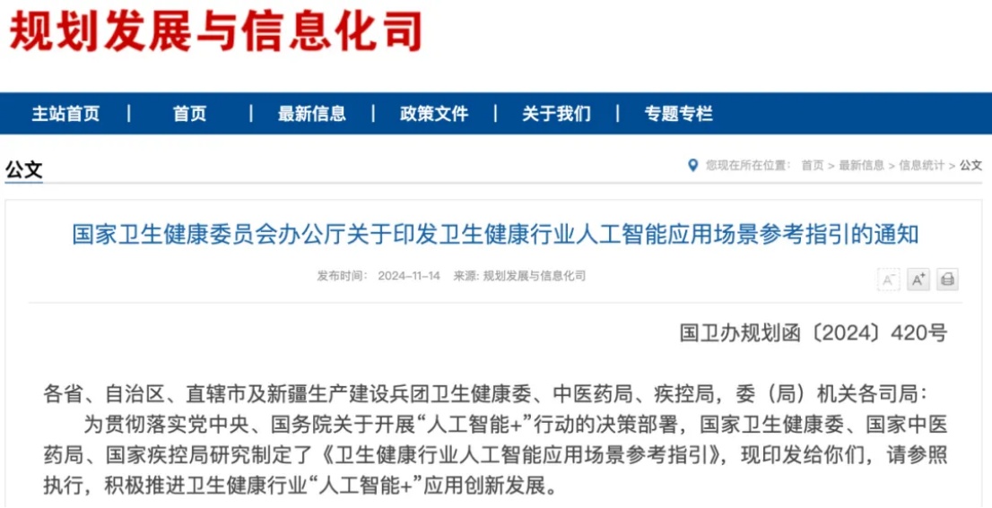 AI医疗的爆发式增长,离不开政策端的强力支持。2024年11月,国家卫生健康委等三部门联合发布《卫生健康行业人工智能应用场景参考指引》,明确将“AI+药物研发”列为重点突破领域,鼓励企业利用AI技术加速创新药开发。
