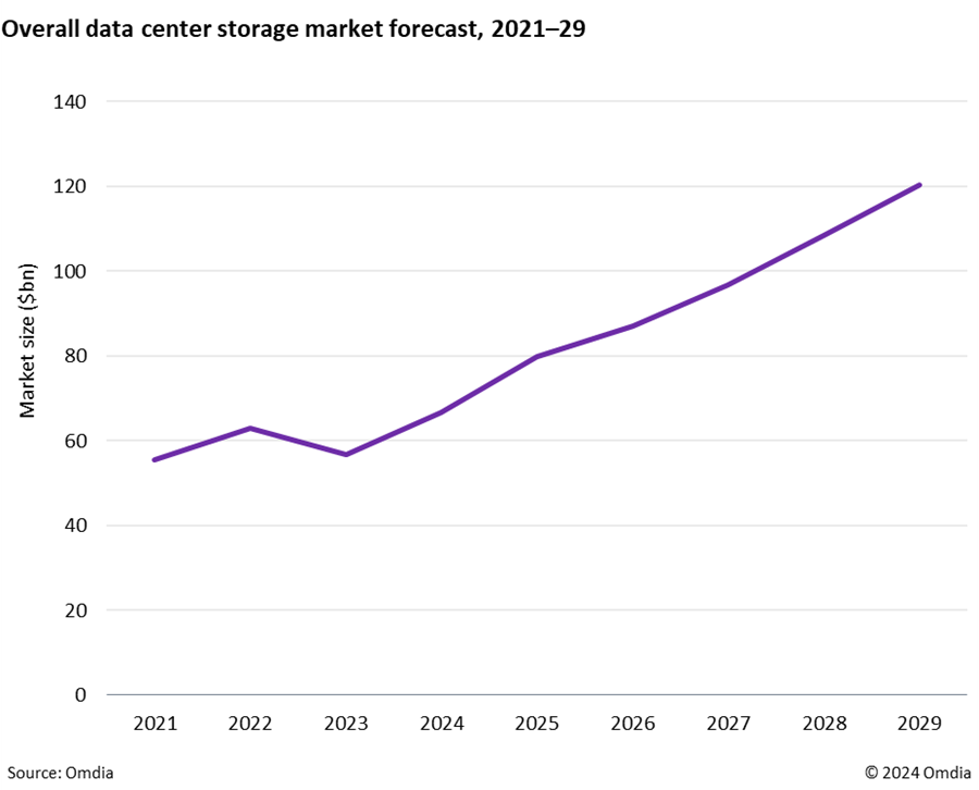 2023年,由于云服务提供商明显地将更大一部分数据中心设备预算转向了基于GPU的服务器,逐渐不再使用通用服务器和存储,存储支出增长有所放缓。2024年,存储增长出现强劲复苏,预计2025年依然如此,随后将趋于平稳,直至2029年。