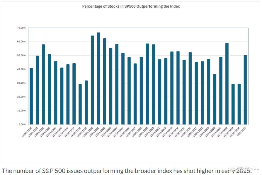 2025年伊始,股市呈现出新的特征,个股表现的分化程度大幅上升,使得更多股票的表现超越了标普500指数。在经历了过去两年市场高度集中的表现后,这一变化为投资者提供了更广泛的机会,特别是那些希望跑赢基准指数的选股者。