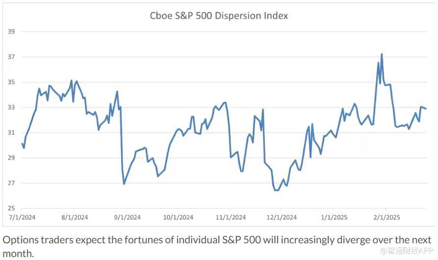 芝加哥期权交易所(Cboe)的个股分化指数(Dispersion Index)近期持续走高,并在1月底创下三年来的新高。通常情况下,该指数在企业财报季会回落,但最近几周反而在上涨。
