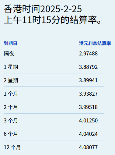 智通财经APP获悉,2月25日,港元拆息全线向下,隔夜息四连跌失守3%,低见2.97488%,创近两周新低,而与楼按相关的一个月拆息亦跌破4%,报3.93827%,为2月17日以来最低。