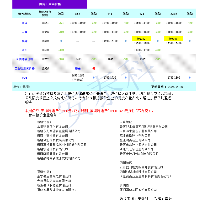 智通财经APP获悉,2月26日,硅业分会发文称,本周工业硅现货价格下跌。过去一周(2025年2月20日-26日),主力合约收盘价从10580元/吨震荡波动至10335元/吨,跌幅为2.32%。全国综合价格为10752元/吨,下跌390元/吨,其中分牌号来看,553为10403元/吨、441为11042元/吨、421为11307元/吨,新疆、云南、福建和四川的综合价格为10531元/吨、11288元/吨、15640元/吨和11500元/吨。FOB价格持稳。