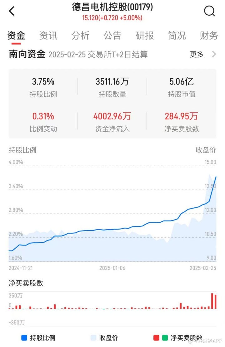 智通财经APP注意到,自2月4日触及月内低点9.9港元后,德昌电机股价异动频频,至2月26日攀升至18.18港元,月内涨幅高达83.6%。本轮行情中,南向资金发挥了关键推动作用。截至2月21日,南向资金持有德昌电机3511.16万股,持股比例为3.75%,持股市值达5.06亿港元。
