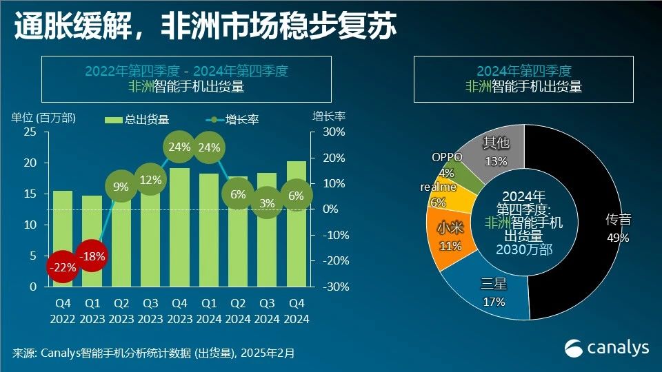 展望未来,非洲市场具有广阔的增长潜力和长期机遇。然而,2025年该地区将面临短期宏观经济压力,包括持续高通胀、货币贬值风险以及经济增长动力有限。Canalys预计,2025年非洲智能手机市场将实现2%的温和增长。