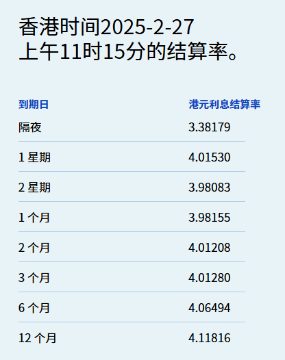 智通财经APP获悉,2月27日,港元拆息普遍向下,其中,隔夜息回落23基点至3.38179%,而与楼按相关的一个月拆息亦微降至3.98155%。反映银行资金成本的三个月拆息险守4%,报4.0128%。六个月及一年期拆息分别报4.06494%和4.11816%。