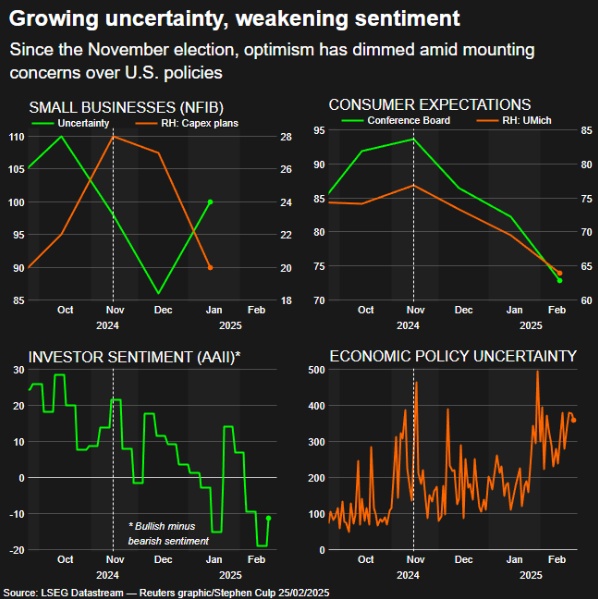 特朗普对政府的改革以及在贸易和其他政策方面的大规模举措不仅没有为投资者带来信心,反而注入了不确定性,并且,消费者和企业对经济前景感到担忧,这令美国例外主义的叙事受到了威胁。
