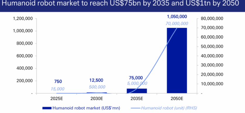 国际大行德意志银行近日在一份研报中表示,人形机器人将在未来十年内迎来大规模机器人生产和广泛应用;德银分析团队预计到2035年,人形机器人市场规模预计将达到750亿美元,以及到2050年,市场规模有望达到1万亿美元,全球销量可能突破7000万台。
