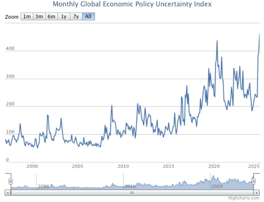 这一情绪蔓延至各个层面,包括经济不确定性指标。由经济学家Scott Baker、Nick Bloom和Steven J. Davis开发的经济政策不确定性指数已超过新冠疫情最严重时期的水平。