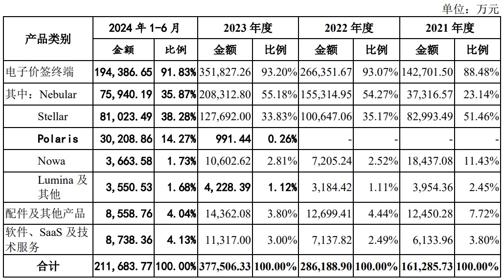 报告期内,公司电子价签终端产品主要包括Nebular、Stellar、Nowa、Polaris和Lumina五大系列,电子价签终端销售占公司主营业务收入的比例分别为88.48%、93.07%、93.20%和91.83%,系公司的主要收入来源。
