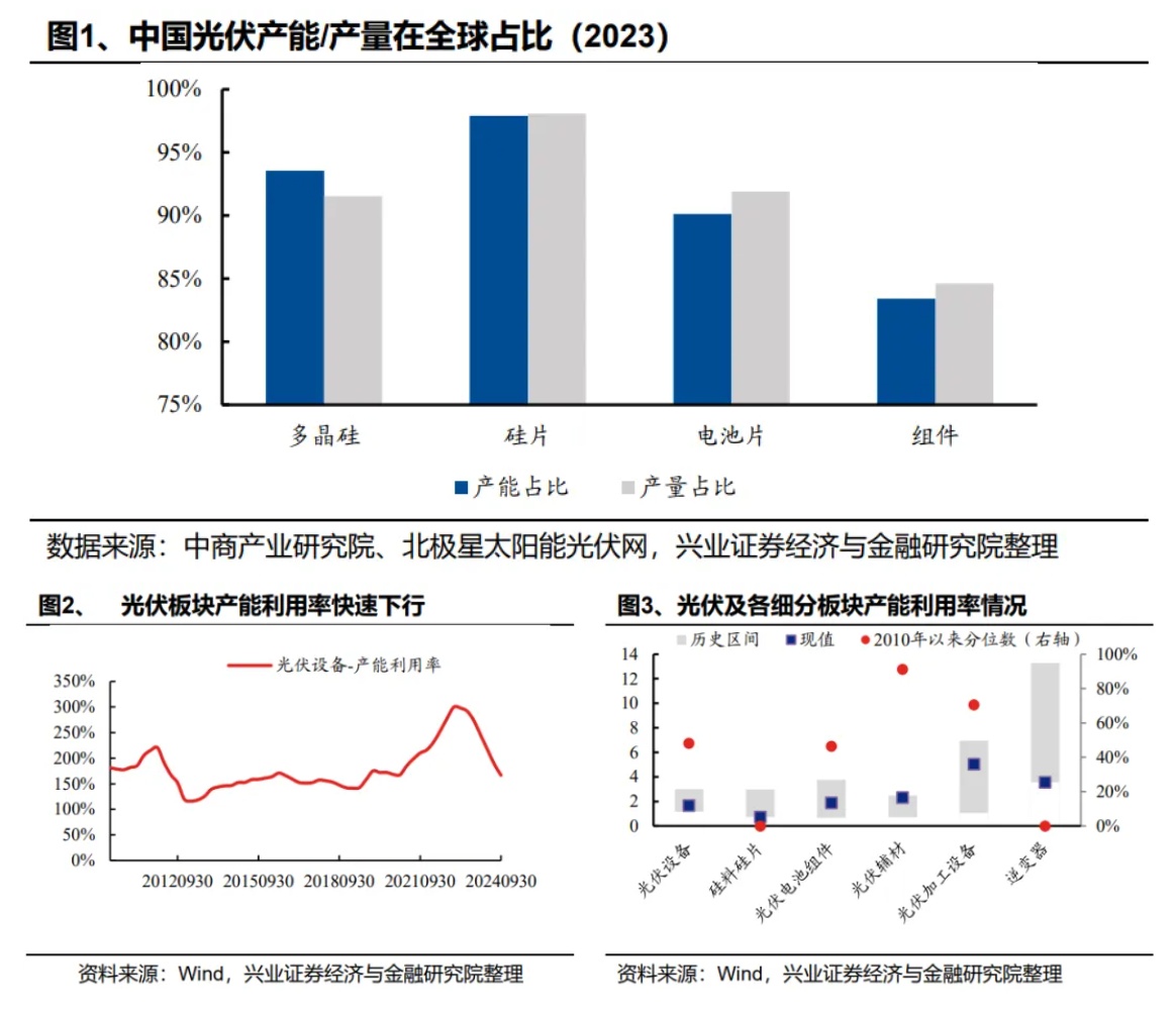 国内光伏行业内卷加剧,产品价格迅速下滑。2023年起在全球碳中和、能源安全、地方政府产业竞赛等因素的驱动下,国内光伏产能快速扩张,各细分环节在全球市占率均在80%以上。但光伏装机需求并未能产能扩张的速度,叠加海外贸易政策扰动对光伏产品出口造成障碍,当前光伏行业面临较为严峻的产能过剩问题。截至2024Q3,以固定资产(含在建工程)周转率TTM衡量的产能利用率加速下行至2010年以来中位数以下。细分行业中,硅料硅片和逆变器的产能利用率均降至低位。