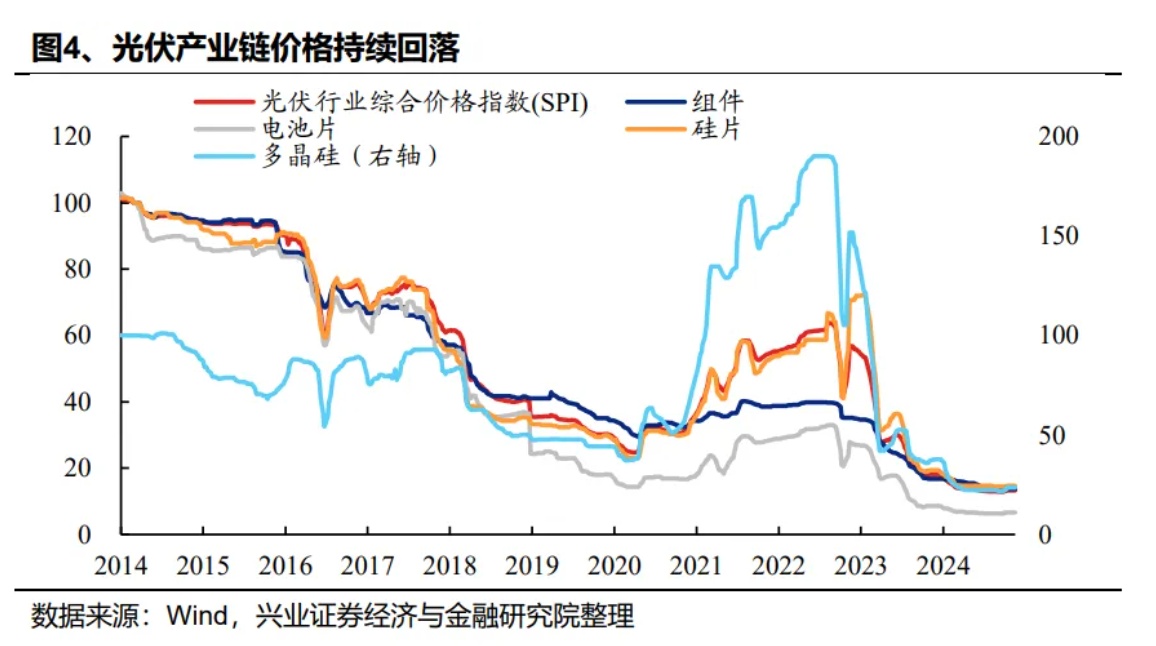 供需失衡下产业链内卷升级,产品价格快速回落,当前各品类已经降至2014年以来的历史底部。2025年初光伏产品(以多晶硅为代表)出现小幅探涨,但供需结构未发生根本变化,涨价幅度和持续性存疑。