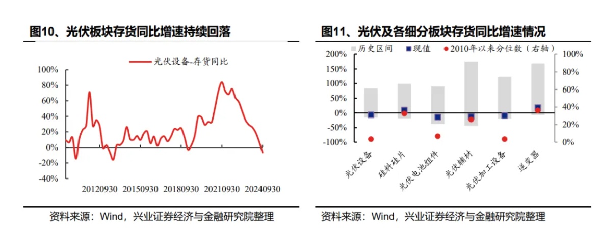 当前光伏板块生产积极性走弱,去库存态度坚决。截至2024Q3,光伏设备板块上市公司存货同比增速已经转负,处在2010年以来3%分位数的底部区间。细分方向来看,组件、加工设备的存货同比增速也基本触底,而辅材则回落至2010年以来年约26%的相对低位。