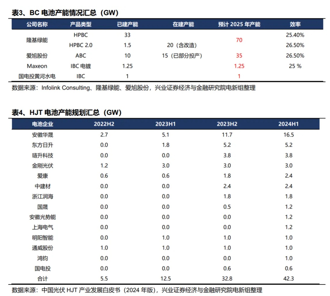 BC与HJT技术已处在量化转化早期,有望推动光伏行业降本增效。目前光伏电池新技术主要包括TOPCon、BC和HJT三种,其中BC及HJT相对于同版型TOPCon单块组件均有20%-30%的功率提升。TOPCon自2023年已经进入大量投产状态,BC与HJT的产能扩张还在初期阶段,随着量产路径的逐步铺平,新技术有望引导行业继续降本增效,从而带来行业盈利回升。