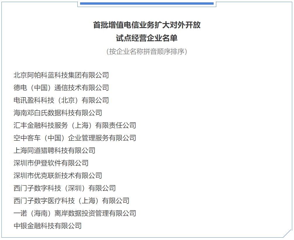 为贯彻落实党中央、国务院关于推动电信领域有序扩大开放的决策部署,工业和信息化部近日向北京、上海、海南、深圳四地13家外资企业发放增值电信业务经营试点批复。相关企业按照批复内容,可开展互联网接入、信息服务等增值电信业务。