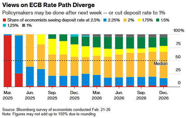 彭博欧元区高级经济学家 David Powell 表示,“欧洲央行几乎肯定会在 3 月 6 日再次降息。然而,此后对进一步宽松的抵制正在加剧。即将召开的会议最有趣的方面可能是对下一步行动的任何暗示。4 月份的决定将是微妙的平衡,但我们预计会暂停。”