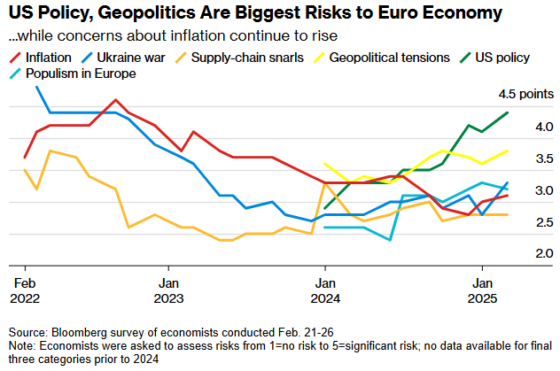 荷兰银行高级经济学家 Bill Diviney 表示:“未来几个月前景可能会发生重大变化。” “美国新政府的关税政策似乎比我们目前认为的更为激进”,同时“有迹象表明,我们可能会看到欧元区政府增加支出,尤其是在国防方面。”