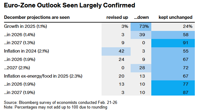 尽管多数人预计欧元区经济扩张将因大西洋彼岸的举措而受到影响,但分析师预计,除了今年的前景更为疲软之外,欧洲央行对国内生产总值和通胀的季度预测不会有重大修改。