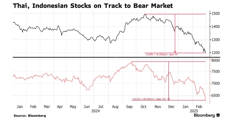 亚洲股市和货币正面临双重打击:特朗普贸易政策的不确定性及美联储降息预期降温的担忧。尤其是特朗普宣称对于加拿大、墨西哥以及中国将加征关税,而不是像此前市场预期的那样进行贸易谈判来推动美国政府叫停加征关税,因此全球关税阴云和全球需求疲软正重创泰国等亚洲地区的出口导向型经济,而印尼虽获债券净流入,却面临资本外流加剧。