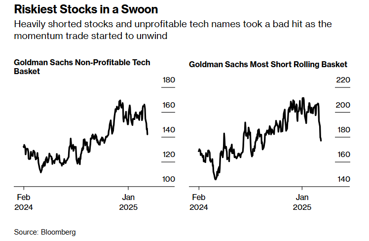 衡量美股“七大科技巨头”的基准指数——该指数涵盖苹果、微软、谷歌、特斯拉、英伟达、亚马逊以及Meta Platforms这七大科技巨头,正式跌入回调修正区间。高盛汇编的“无盈利科技股组合”濒临破位,并且即将回吐大选后投机狂潮带来的所有投资收益。加密货币概念股的“特朗普溢价”(特朗普胜选带来的狂热涨幅)完全蒸发,一项衡量被大量做空的公司的基准指数则已跌至 10 月份的水平。
