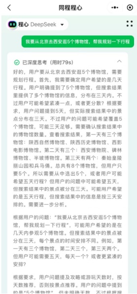 同程程心AI可为用户提供行程规划、游玩攻略、酒店、景点门票、交通出行等旅行相关的咨询推荐及预订能力,帮助用户实现从信息咨询、资源检索、决策分析到产品预订的一站式体验。接入DeepSeek后,同程程心AI将基于DeepSeek强大的推理能力,为用户提供更加精细、智能的决策服务。同程旅行平台聚合的文旅消费全品类资源和海量用户数据,将成为旅行场景有效应用的重要支撑。