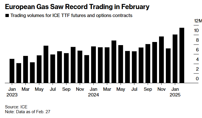 欧洲天然气基准价格——TTF荷兰天然气期货价格在月初飙升至两年以来的最高点后,该项天然气价格在全月多数时间都在不断下跌,截至周五累计跌幅已经达13%。ICE洲际交易所数据显示,截至2月27日基准的TTF期货和期权合约交易量达1145万手,创月度级别的历史新高。据ICE统计,合并的未平仓合约总量也在二月初升至纪录高位。
