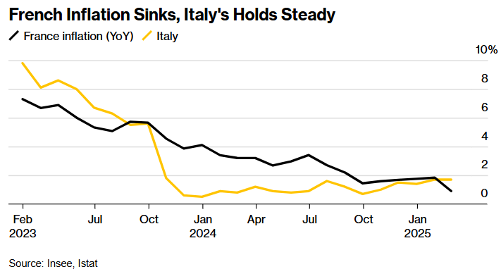法意两国均呈现服务类型的价格涨势大幅趋缓,这正是欧洲央行重点监测的领域。在法国与意大利的最新通胀数据公布之后,欧元区的利率期货市场普遍预期欧洲央行将在下周再度下调基准利率。自2024年以来欧洲央行已经连续多次降息,这一政策立场与维系利率稳定不变的美联储截然不同,并且市场预计美联储有可能在今年一整年选择“不降息”。