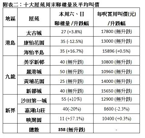 港岛区方面,中原地产太古城东山阁资深区域营业董事赵鸿运表示,近日区内二手交投靠稳,太古城本月录18宗买卖成交,环比增4宗,升幅达28.6%。每呎实用呎价亦微升0.5%,报14066港元。太古城周末录27组看楼预约,气氛造好,二手业主趁市况畅旺,积极加快放售步伐,每呎实用叫价维持稳定,保持在17800港元水平。