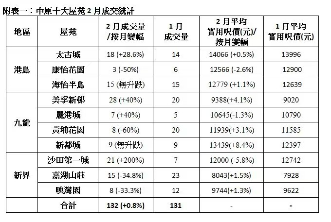 智通财经APP获悉,中原地产十大屋苑2月录得132宗成交,较1月增加1宗,交投量为去年农历新年2月118宗后12个月次低。呎价方面,2月十大屋苑有3个屋苑平均呎价下跌,跌幅介于1.3%至5.8%。至于看楼量方面,财政预算案公布后首个周末,十大屋苑录约358组预约看楼量,按周无升跌。