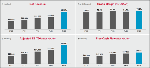 过去五年,该公司在财务指标上取得了显著改善:营收从2020年的约240亿美元增长至2024年的约520亿美元,年均复合增长率(CAGR)达21.2%;毛利率从2020年的73.5%提升至2024年的76.5%;调整后EBITDA从2020年的136亿美元增长至2024年的318亿美元,CAGR为23.7%;自由现金流(FCF)从2020年的115亿美元跃升至2024年的194亿美元。基于强劲的现金流,公司通过股息和股票回购向股东返还了大量资本。