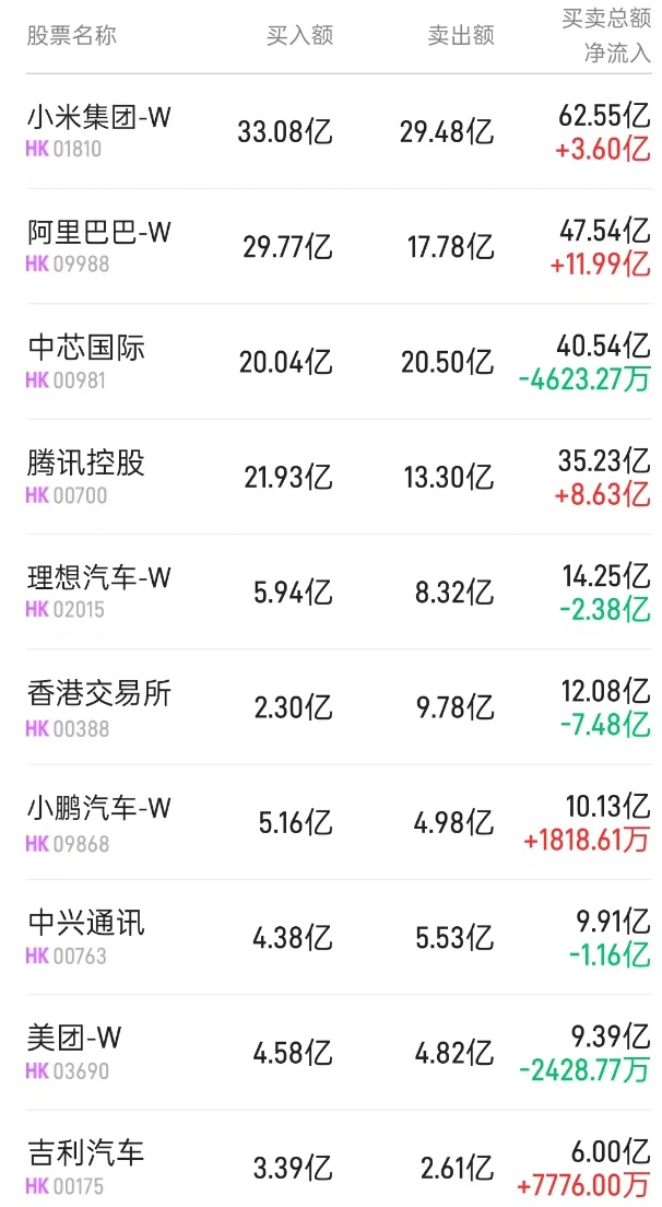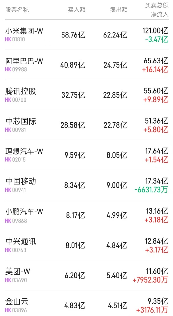 此外,美团-W(03690)获净买入5523万港元,而中国移动(00941)遭净卖出6631万港元。