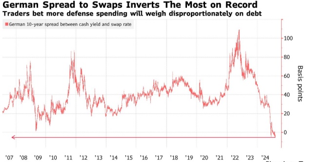 对德国国债供应变化敏感的一个压力阀——德国国债掉期息差——跌至创纪录低点,反映出投资者的担忧,他们将承担吸收更多抛售的风险。丹麦银行首席分析师Jens Peter Sorenson表示:“国防开支看起来既将是国家层面的,也将是欧盟层面的——但毫无疑问,国防开支将大幅增加。长期债券的发行量将会增加,因此投资者希望获得风险溢价。”