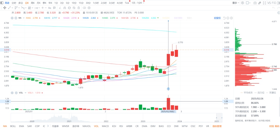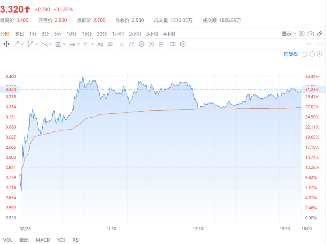 2月26日,高途股价高开高走,开盘1个半小时内便冲到全天最高点3.4美元,最终大幅收涨31.23%,当日放出天量1510.05万股,换手率达5.96%,显著高于此前水平。