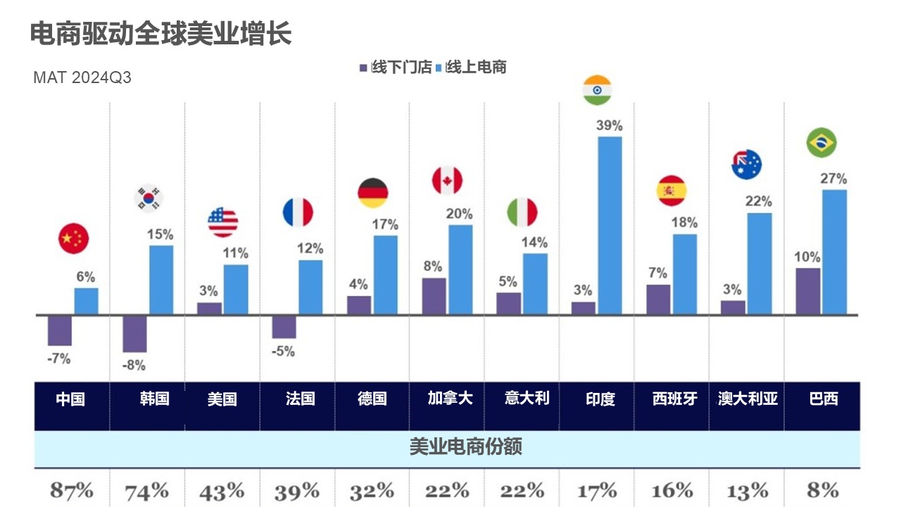 电子商务正在推动全球美妆产品的销售,且各地区的成长水平各不相同。在中国,令人瞩目的是,头发护理和护肤产品总销售额的87%是透过在线上渠道实现。在印度,17%的美妆产品是在线购买,而在巴西,这一比例低于10%。尽管存在这些差异,但就美妆个护产品而言,网上销售超越实体店是大势所趋。