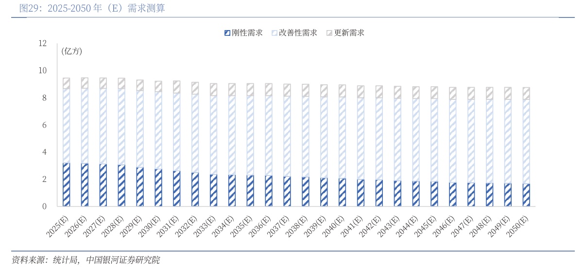 据中国银河证券测算,预计2050年,房地产行业的总需求将达到8.75亿方以上,其中,刚性需求、改善性需求、更新需求分别为1.689亿方、6.185亿方、0.878亿方,分别占总需求的19.30%、70.67%、10.03%。随着人口增长乏力、城镇化率提升速率变缓,改善性需求或成为总需求的中流砥柱。