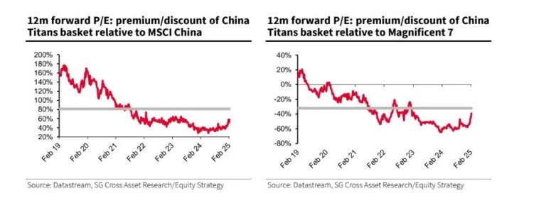 中国 “七大巨头” 的估值溢价已从2021年前的115%降至目前的约55%。仍比过去五年平均溢价低约20个百分点。与美国“七巨头”相比,则存在更大程度的估值折价,目前折价大约45%。