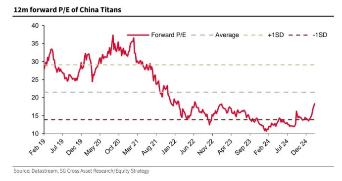 若以中国七巨头——腾讯、阿里、小米、比亚迪、中芯国际、京东以及网易来对标美股“七巨头”,业绩增长强劲的中国七巨头在估值层面可谓便宜得多。法兴银行发布的一份研报显示,在互联网行业监管收紧后,中国 “七大巨头” 的估值几乎下降了 50%,此后远期市盈率一直窄幅波动,在 14x- 20x之间。尽管近期股价有所反弹,但该组合仍未达到过去三年区间的上限,仍较过去五年平均水平低约 10%。