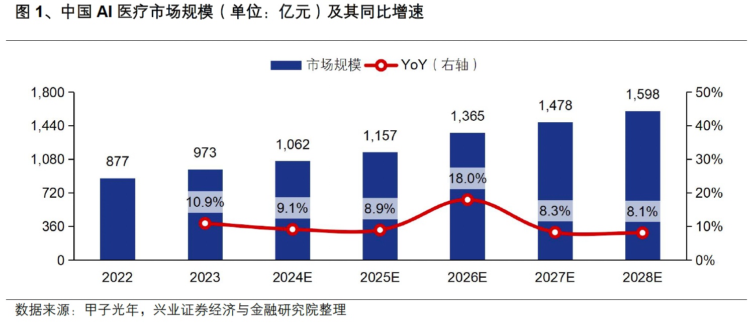 伴随AI技术的不断进化,AI在各个领域的应用得以快速推进,这其中AI和医疗的结合尤其引人瞩目。行业数据显示,2023年我国AI医疗市场规模约为973亿元,预计到2028年将突破1500亿元,2022-2028年复合增长率有望达到双位数。