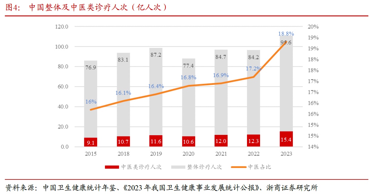 近年来,在老龄化加剧、慢性病常发、亚健康人群扩大等背景下,中医因可提供长期且温和的调理型解决方案而受到推崇。中医行业叠加国家层面出台多项政策支持,需求持续景气。数据显示,2018-2023年全国中医诊疗人次从10.7亿提升至15.4亿,对应期间年复合增长率达到7.5%,高于同期整体诊疗人次2.8%的增速水平。2023年,全国中医诊疗人次占比(不含村卫生室)已提升至18.8%。