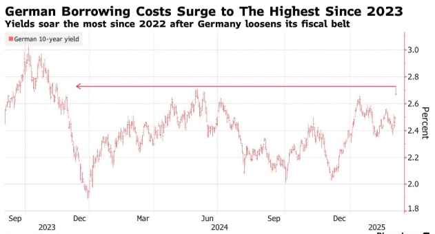 智通财经APP获悉,由于投资者准备迎接为国防和基础设施投资提供资金的政府融资出现历史性增长,德国债券暴跌,欧元飙升。德国10年期国债收益率一度上涨23个基点,至2.73%,创下2022年6月以来的最大涨幅,此前候任总理弗里德里希•梅尔茨提出了全面的财政改革方案。欧元兑美元上涨0.6%,至1.0689,有望创下2022年末以来的最大三天涨幅,德国股市上涨,因投资者押注支出增加将提振欧洲经济。