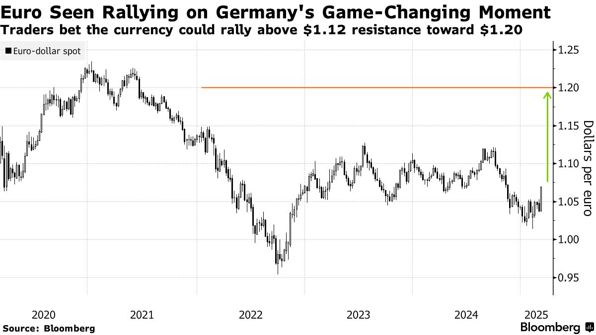 在对欧元区国家额外支出将刺激经济增长的押注下,欧元兑美元目前已攀升至去年11月以来的最高水平。而就在一个月前,欧元距离与美元平价仅一步之遥,欧元兑美元汇率一度跌至1.02。