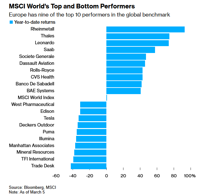 Bloomberg汇编的数据显示,泛欧斯托克600指数季度表现超过标普500指数的幅度有望达到10年来的最高水平。此外,今年以来MSCI全球指数中表现最好的10只股票里,有9只来自欧洲,其中包括国防类股莱茵金属、泰雷兹(Thales SA)、Leonardo SpA和Saab AB。