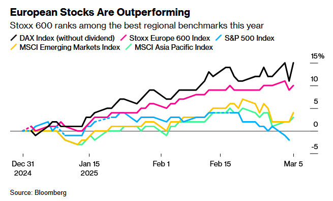 相比之下,欧洲股市是今年以来全球表现最好的股市之一,投资者押注于欧洲的经济刺激计划和俄乌停火将有助于欧元区经济复苏。事实证明,在投资者纷纷远离昂贵的美国股市之际,欧洲股市较低的估值也颇具吸引力,暂时盖过了对全球贸易战的担忧。