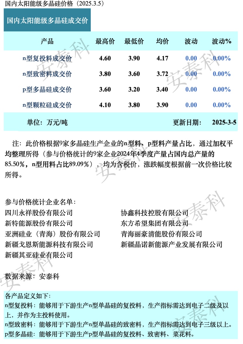 智通财经APP获悉,硅业分会发文称,本周多晶硅开始新一轮签单,价格持稳。n型复投料成交价格区间为3.90-4.60万元/吨,成交均价为4.17万元/吨,n型颗粒硅成交价格区间为3.80-4.10万元/吨,成交均价为3.90万元/吨,p型多晶硅成交价格区间为3.20-3.60万元/吨,成交均价为3.40万元/吨。