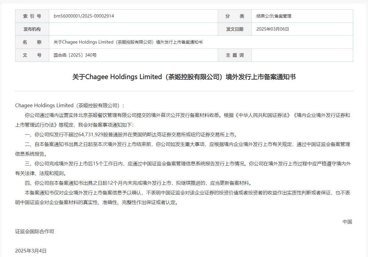智通财经APP获悉,3月6日,证监会发布《关于Chagee Holdings