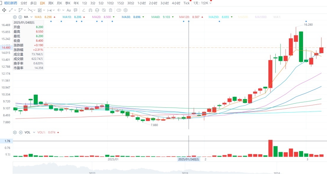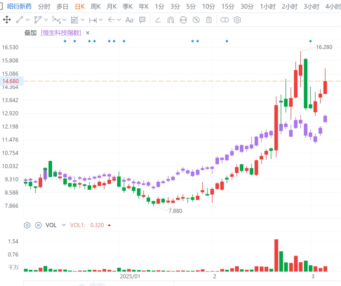 据悉,昭衍新药是目前AH两地为数不多明确进行AI辅助业务的CXO龙头企业,正好契合了此轮Deepseek概念启动的牛市,也由此成为了一次风口上的“AI医疗概念股”,与目前大热的恒生科技指数形成了共振。