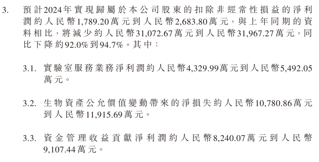 1月24日,昭衍新药(06127)披露盈警,预计2024年度归母净利润同比下降约77.8%到85.2%。